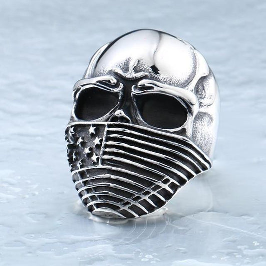 Stainless Steel Men's American Flag Skull Ring, Silver Color