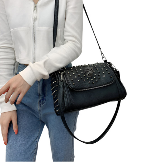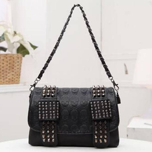 Vintage Skull Studded Rivet Shoulder Bag w/ Free Skull Wallet, Eco-Leather, Black