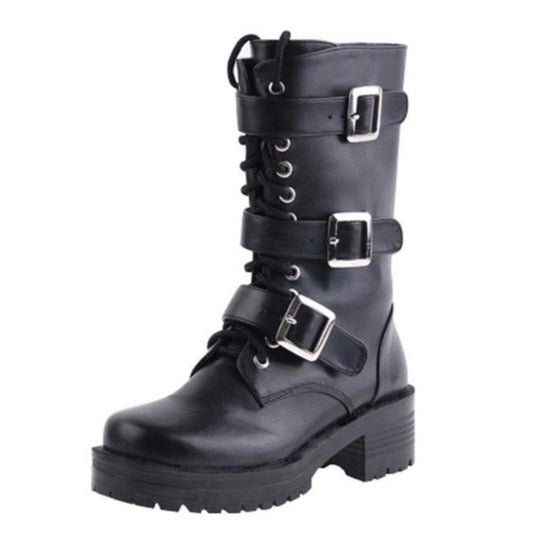Women's Punk Lace-Up Buckle Straps Mid-Calf Boots