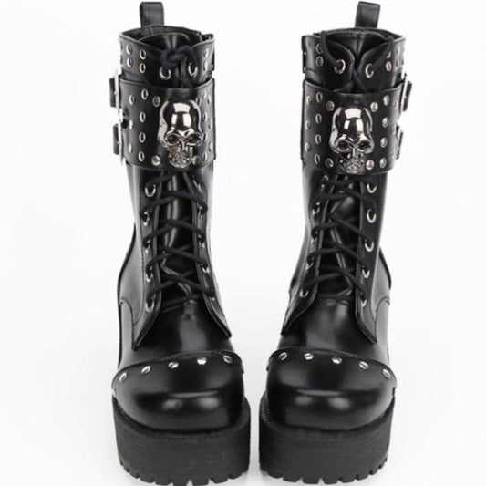 Heeled Gothic Skull Lace-Up Boots w/ Rivets, PU Leather, Black