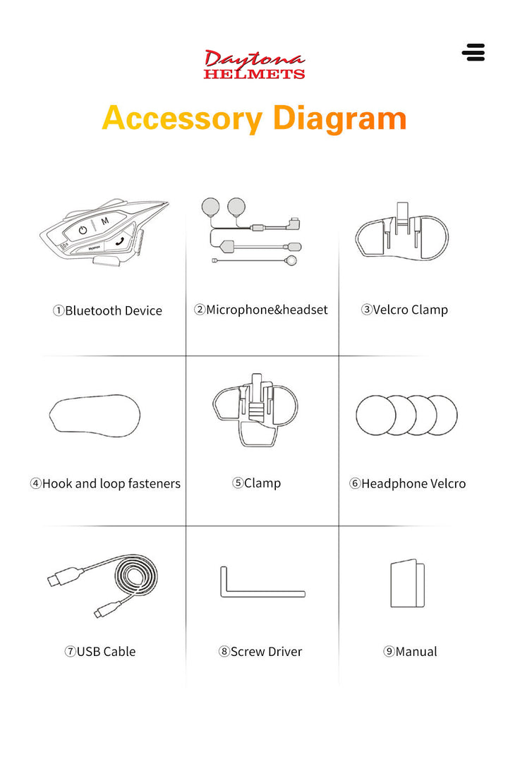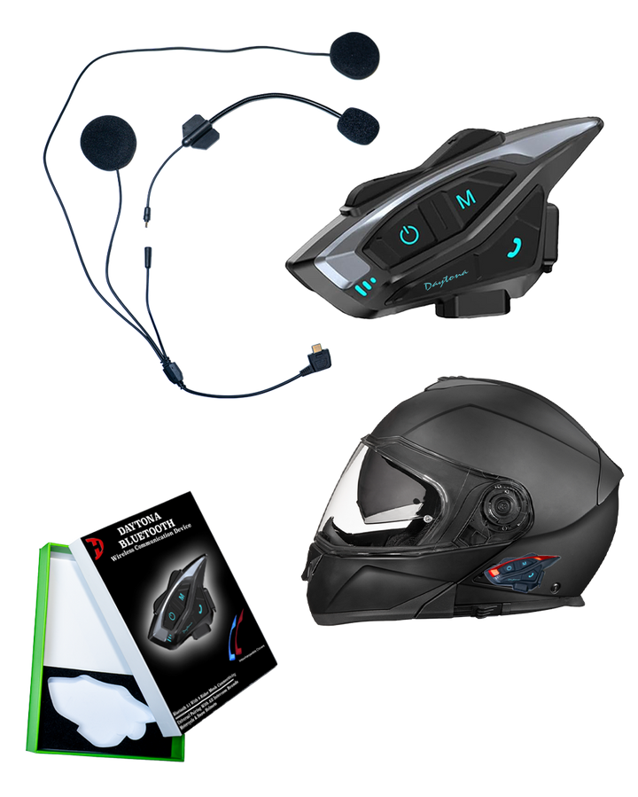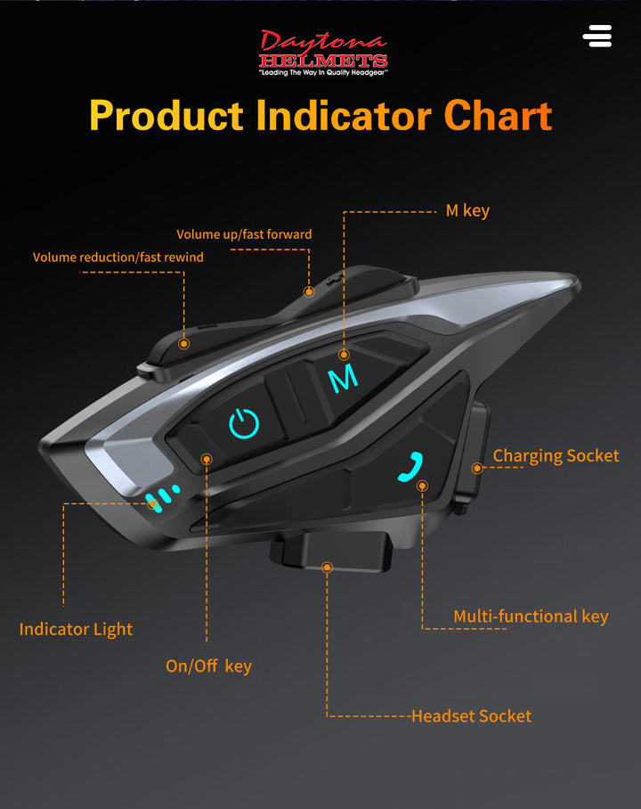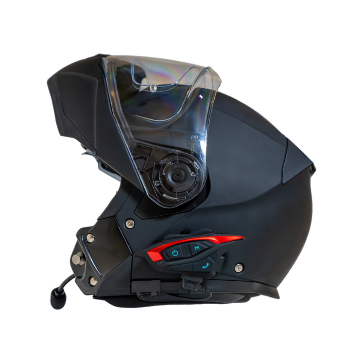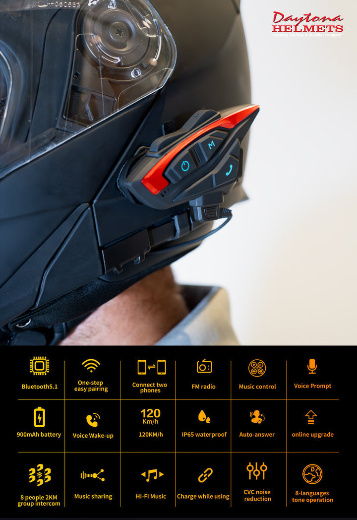 Our Bluetooth device is a universal Bluetooth system designed to work with all full-face or open-face helmet models. It can pair with intercoms from other brands, has a range of 1.2 miles (2km), and can connect with up to 8 people. Additionally, it can be paired with any Bluetooth-enabled device. The average usage time is 28 hours for intercom communication and 33 hours for playing music. Moreover, the accent piece on the device can be exchanged for different colors, such as red, green, or grey.