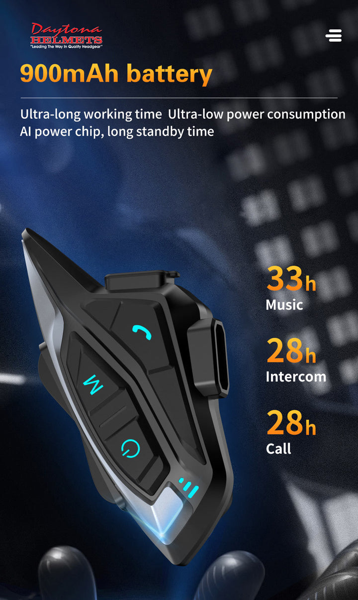 • 900mAh Battery Capacity, 28 Hours Intercom/Phone, 33 Hours Music.