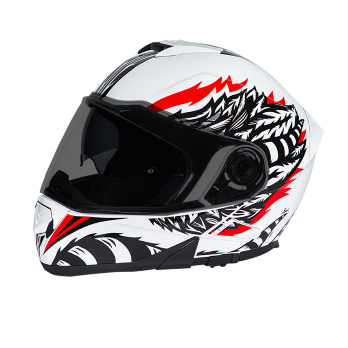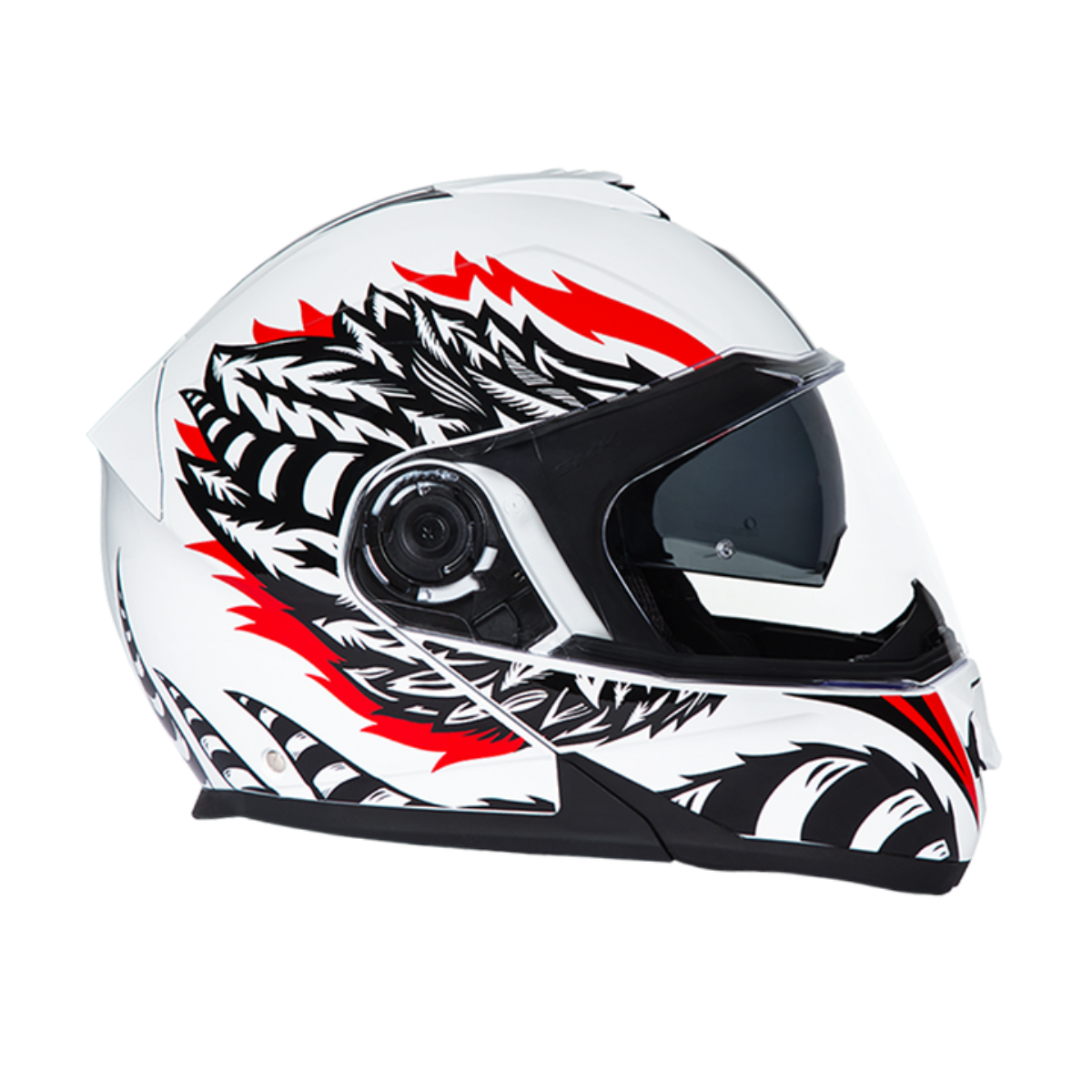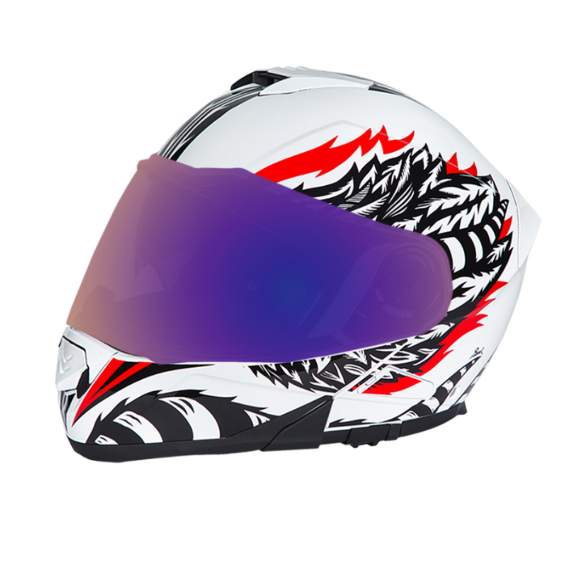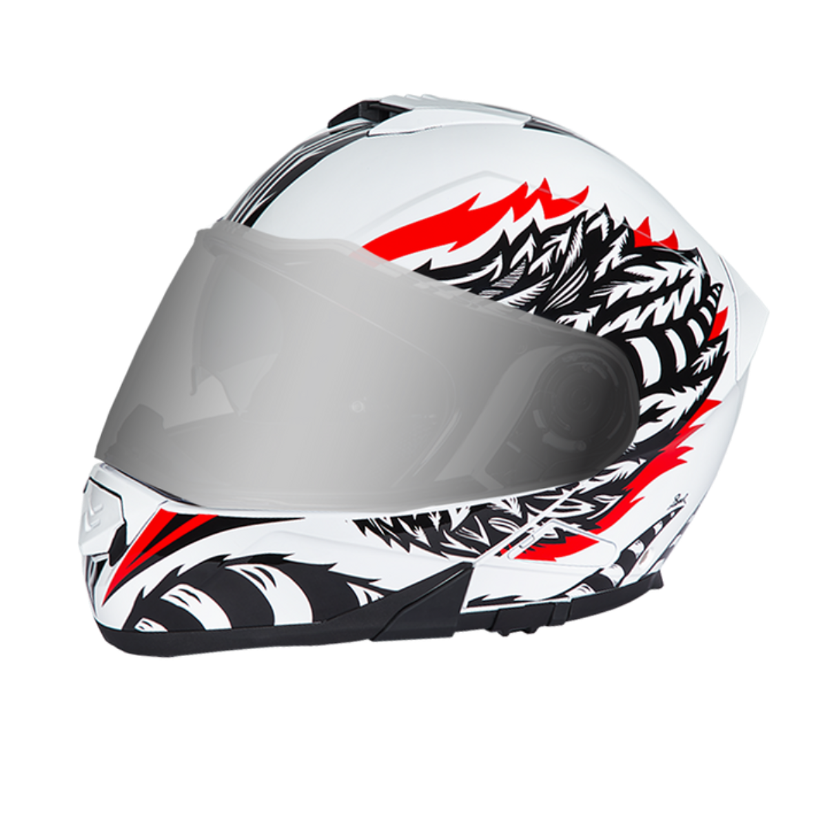 Our D.O.T. Daytona Glide Modular Helmet, With Inner Anti-Scratch Retractable Smoke Shield, In The Phoenix Graphic, Meets And Exceeds D.O.T. FMVSS 218 Standards.  With 2 Different Shell Sizes, You're Sure To Get That Proportionate Fit!!  This Modular Helmet Comes In A Clear Lacquer Finish.  Also Available In Custom Colors: Gun Metal Grey Metallic, Silver Metallic, Black Cherry Metallic And Fluorescent Yellow.  Basic Colors; Soft Touch Dull Black, Hi-Gloss Black And Hi-Gloss White.  Features A Dual Shield System; Outer Anti-Scratch Clear Shield With Pinlock 30 Lens (Anti-Fog) And Inner Anti-Scratch Retractable Smoke Shield.  Also Has A Quick Release Lock Retention System; One Finger Release Lever For Easy Detachment, Adjustable Chin And Forehead Ventilation And A Removable, Hand Washable Interior (Moisture Wicking Fabric).  Bluetooth Compatible.  Free Head Wrap And Draw String Bag Included.  Sizes Range From XS-2XL.