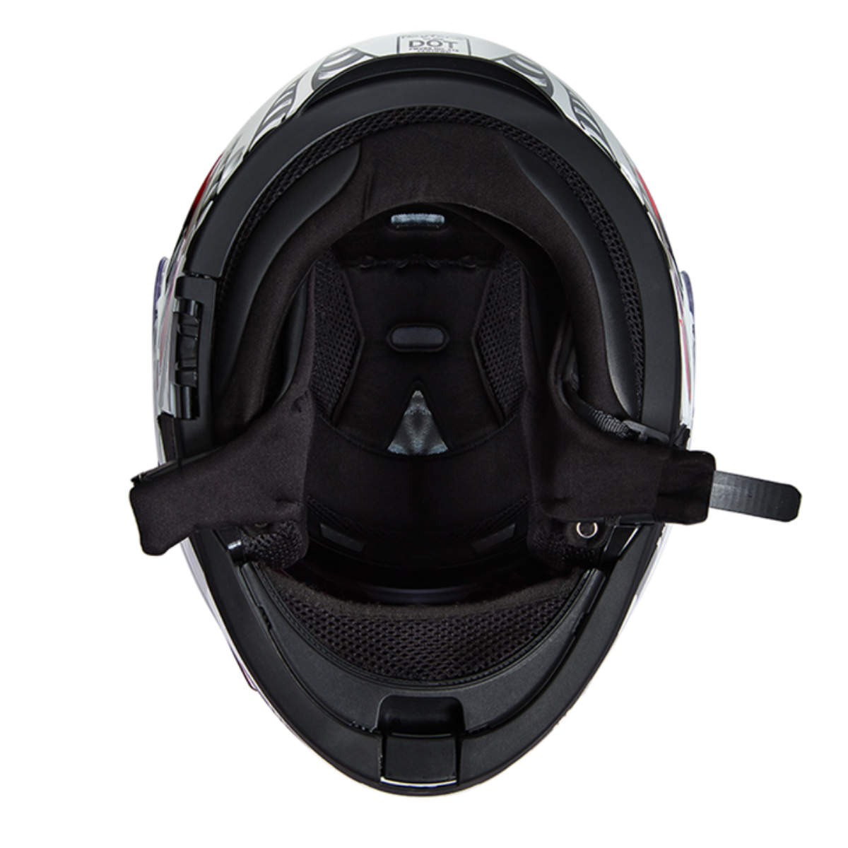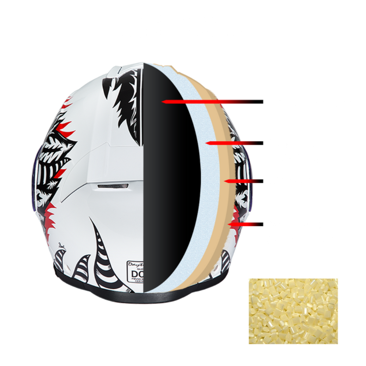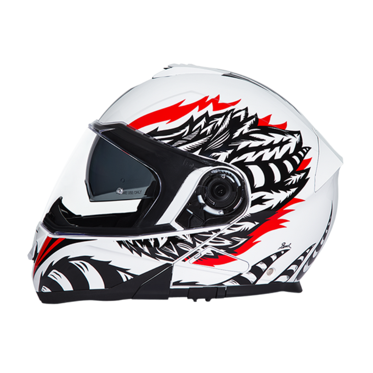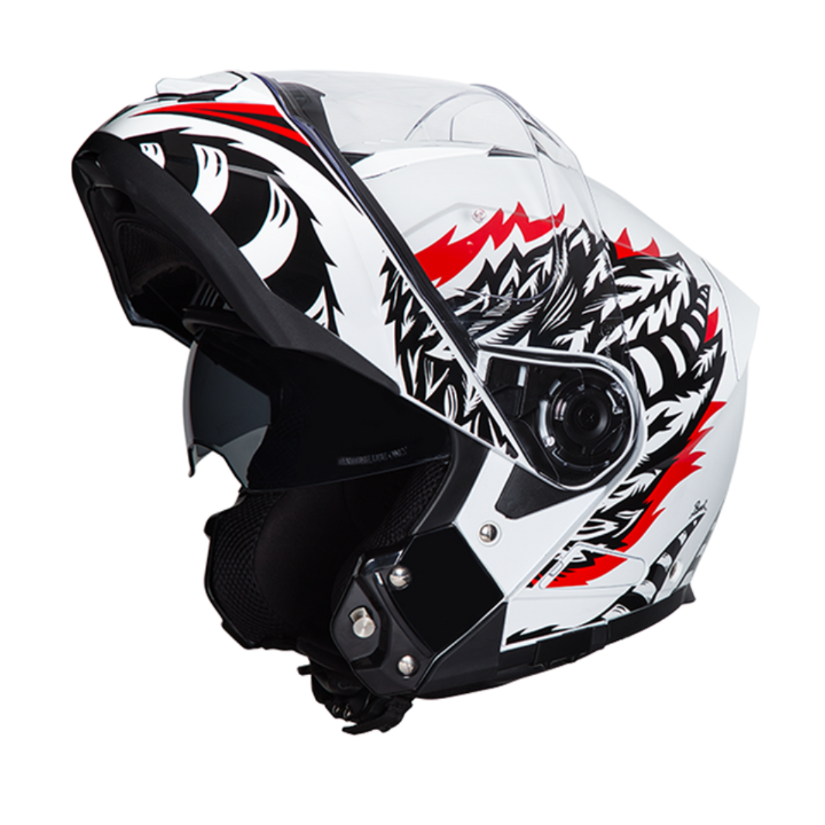 Our D.O.T. Daytona Glide Modular Helmet, With Inner Anti-Scratch Retractable Smoke Shield, In The Phoenix Graphic, Meets And Exceeds D.O.T. FMVSS 218 Standards.  With 2 Different Shell Sizes, You're Sure To Get That Proportionate Fit!!  This Modular Helmet Comes In A Clear Lacquer Finish.  Also Available In Custom Colors: Gun Metal Grey Metallic, Silver Metallic, Black Cherry Metallic And Fluorescent Yellow.  Basic Colors; Soft Touch Dull Black, Hi-Gloss Black And Hi-Gloss White.  Features A Dual Shield System; Outer Anti-Scratch Clear Shield With Pinlock 30 Lens (Anti-Fog) And Inner Anti-Scratch Retractable Smoke Shield.  Also Has A Quick Release Lock Retention System; One Finger Release Lever For Easy Detachment, Adjustable Chin And Forehead Ventilation And A Removable, Hand Washable Interior (Moisture Wicking Fabric).  Bluetooth Compatible.  Free Head Wrap And Draw String Bag Included.  Sizes Range From XS-2XL.