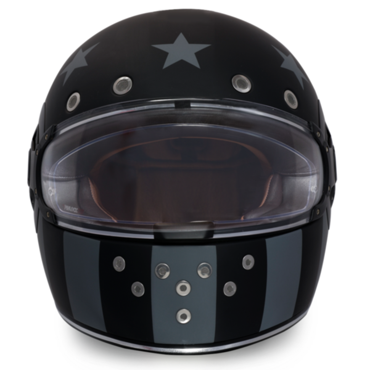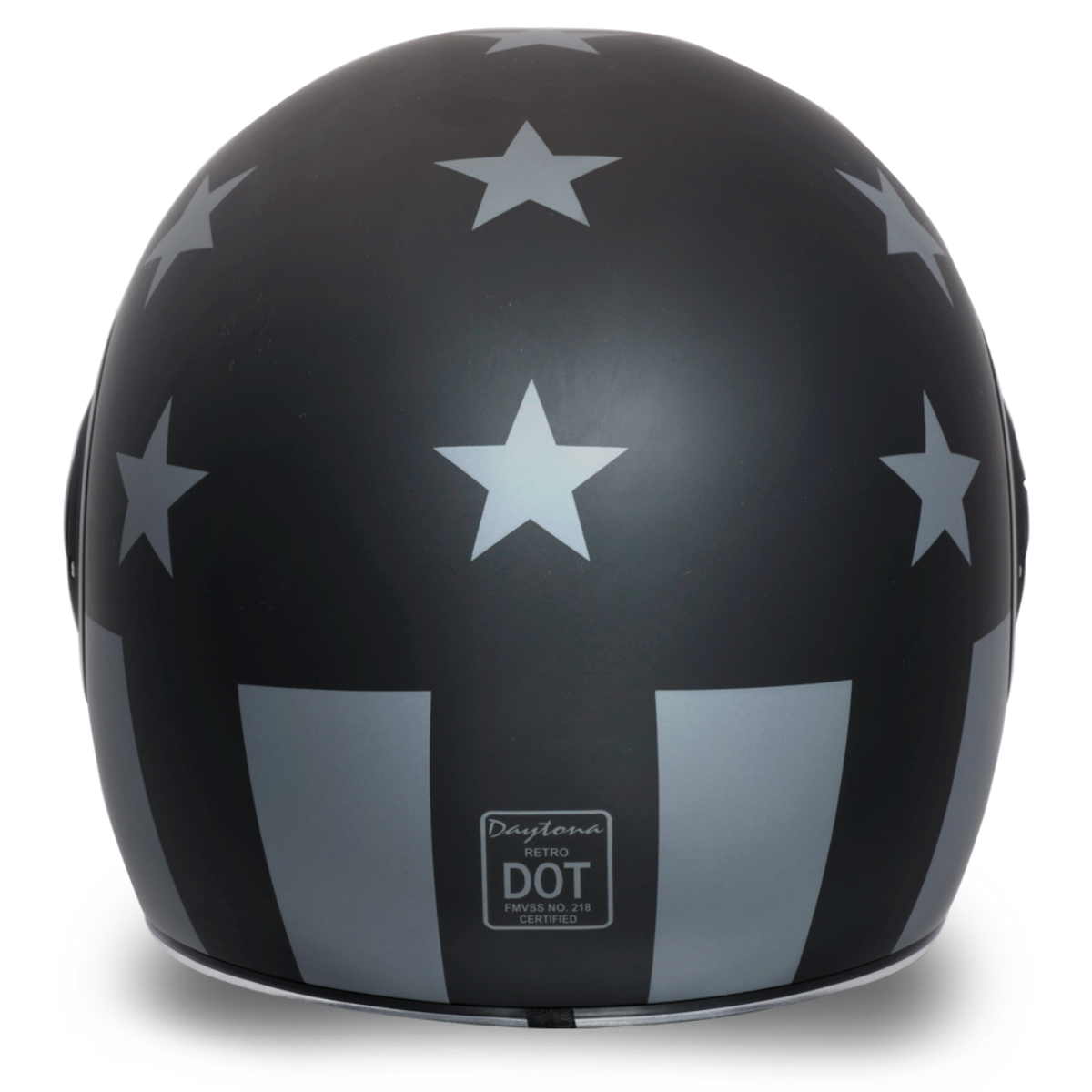 Our D.O.T. Daytona Retro Full Face Helmet In The Captain America Stealth Graphic, Meets And Exceeds D.O.T. FMVSS 218 Standards.  With 2 Different Shell Sizes, You're Sure to Get That Proportionate Fit!!  The Retro Has The Classic Vintage Look Of Yesterday.  Features A Vintage Outer Anti-Scratch Clear Shield With Pinlock 70-R Lens (Anti-Fog).  Also Has A Nylon Strap D-Ring Retention System, Chin And Forehead Ventilation, and a Removable, Hand Washable Interior (Moisture Wicking Fabric) With Premium Interior Leather Accents.  Free Head Wrap And Draw String Bag Included.  Sizes Range From XS-2XL.